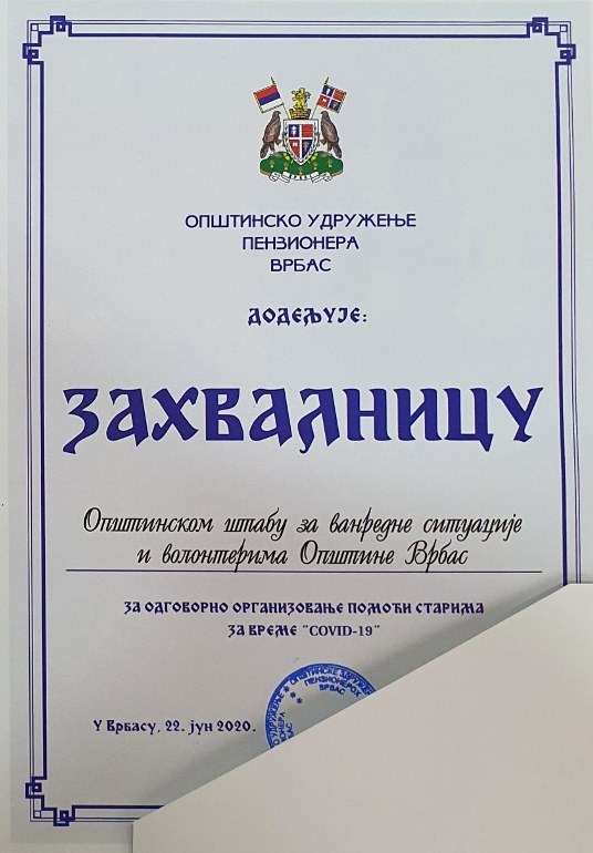 Удружењу пензионера искористило је прилику и да уручи захвалницу Штабу за ванредне ситуације општине Врбас и његовим волонтерима, који су за време ванредног стања несебично помагали најстаријим суграђанима.