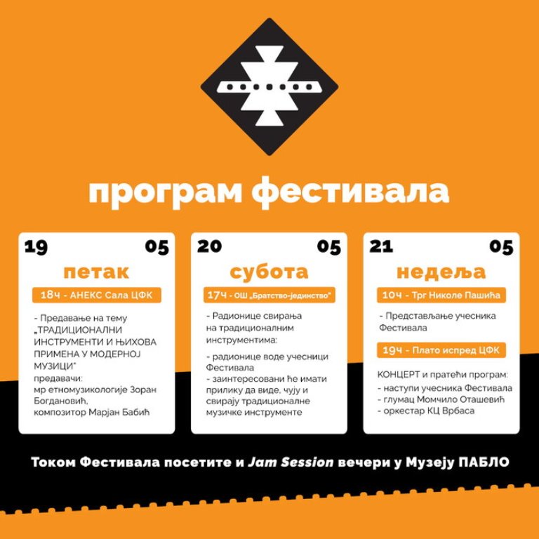 Последњи дан Интернационалног фестивала свирања на традиционалним инструментима, у недељу у 10.00 часова на Тргу Николе Пашића, почиње представљањем свих учесника. Програм се даље наставља у 19.00 часова испред платоа Центра за физичку културу где ће наступати амбасадор овогодишњег фестивала глумац Момчило Оташевић, учесници фестивала и оркестар Културног Центра Врбас. Пропратни програм фестивала одржаће се у Музеју Пабло где ће се сваког дана у вечерњим часовима организовати Jam session у оквиру којих ће се музичари окупити зарад неформалног дружења и свирања.