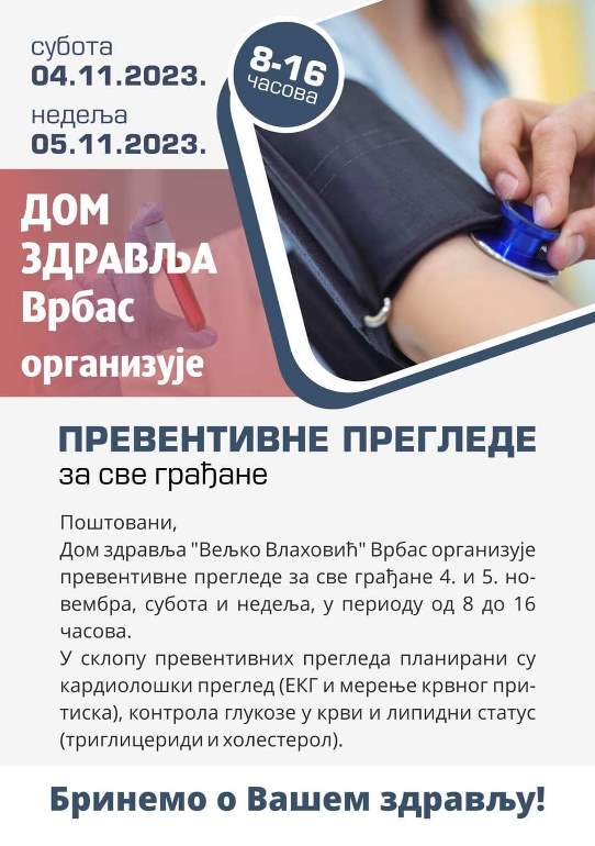 Републички фонд за здравствено осигурање (РФЗО) саопштио је да ће и овог викенда у 170 здравствених установа широм Србије грађани моћи да ураде превентивне прегледе. У акцију је поново укључен и Дом здравља "Вељко Влаховић".