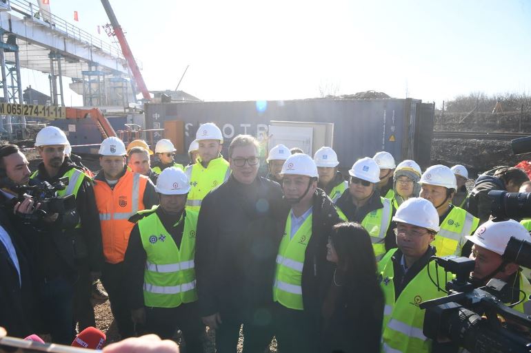 Представници кинеске компаније показали су Вучићу и два моста челично-решеткасте конструкције преко канала, које су изградили на овој прузи, радионицу у којој варе шине на безбедан начин, машинске склопове које полажу колосеке. Они су истакли да, осим градње инфраструктуре, доста пажње посвећују друштвеној одговорности и да су потписали уговоре са 55 српских фирми, запослили више од 200 српских радника. "Дирекно или индирекно запошљавамо више од 1.000 српских радника", рекли су представници кинеске компаније Вучићу.