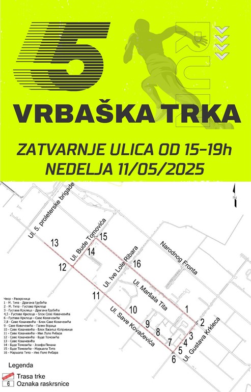 "Старт и циљ трке биће на Тргу Николе Пашића, на раскрсници са улицом Маршала Тита. У дану за трке, у периоду од 15.00 до 19.00 часова, биће затворене одређене улице у граду и то: од Трга Николе Пашића улицом Маршала Тита до раскрснице са улицом Густава Крклеца (код Поште), од раскрснице Маршала Тита са улицом Густава Крклеца до улице Саве Ковачевића, од раскрснице улице Густава Крклеца и улице Саве Ковачевића до раскрнице улице Саве Ковачевића и улице Буде Томовића, 100 метара од раскрснице улице Саве Ковачевића и Буде Томовића (окретница) до раскрснице улице Саве Ковачевића и улице Буде Томовића, од раскрснице улице Саве Ковачевића и улице Буде Томовића до раскрснице улице Буде Томовића и улице Маршала Тита, и од раскрснице улице Буде Томовића и улице Маршала Тита до старта. Дужина трасе је 2.500 метара, тркачи који трче 5 км иду 2 круга, а 10 км 4 круга", саопштено је из Врбашког атлетског клуба.