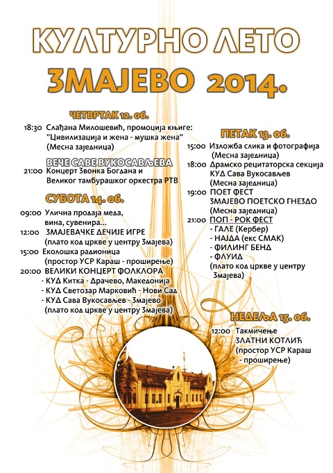 "Ово је година два велика јубилеја. Први је обележавање стогодишњице од рођења Саве Вукосављева, по којем КУД носи име, а други је обележавање 20 година сарадње са Културно-уметничким друштвом 'Китка' из Драчева у Македонији. Верујемо да смо веома богатим културним, едукативним и спортским програмом свакоме понудили по нешто интересантно. Позивамо све заинтересоване да у буду наши гости, јер смо убеђени да ће из Змајева понети само лепе утиске. Због тешке ситуације која је задесила наше грађане после поплава које су погодиле бројна подручја у Србији, неколико манифестација у оквиру 'Културног лета Змајево 2014' ће бити хуманитарног карактера", наводи се у саопштењу Организационог одбора манифестације.