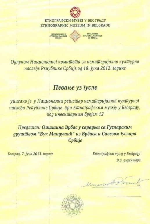 Унесков Међувладин комитет, на свом редовном, 13. заседању на Маурицијусу 29. новембра, донео је одлуку о упису "Певања уз гусле" као нематеријалног наслеђа Републике Србије, на Унескову Репрезентативну листу нематеријалног културног наслеђа човечанства. Иницијатори заштите "Певања уз гусле" били су КУД гуслара "Вук Мандушић" из Врбаса, и oпштина Врбас, у сарадњи са Савезом гуслара Србије, саопштено је из овог КУД-а.