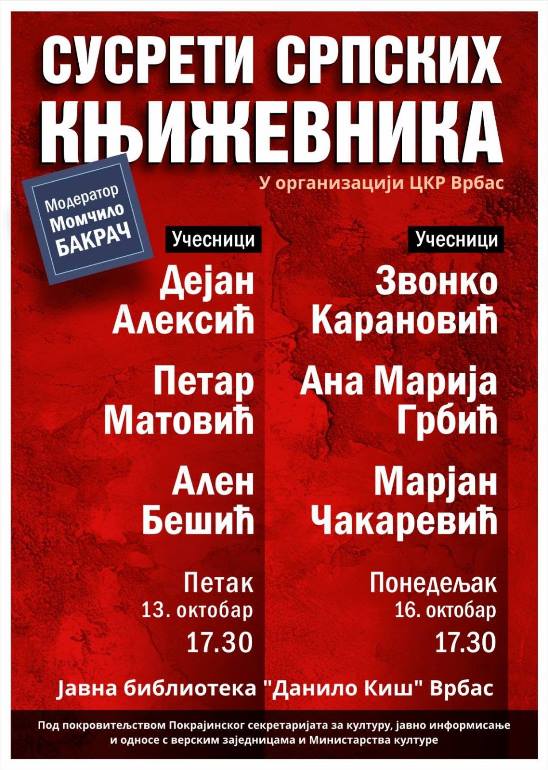 Сусрети српских на програму су у петак, 13. октобра, и у понедељак, 16. октобра, такође у Јавној бибилотеци "Данило Киш". Првога дана о књижевности и књижевном стварању говориће Дејан Алексић, Петар Матовић и Ален Бешић, а другог Звонко Карановић, Ана Марија Грбић и Марјан Чакаревић. Модератор у оба сусрета биће Момчило Бакрач.