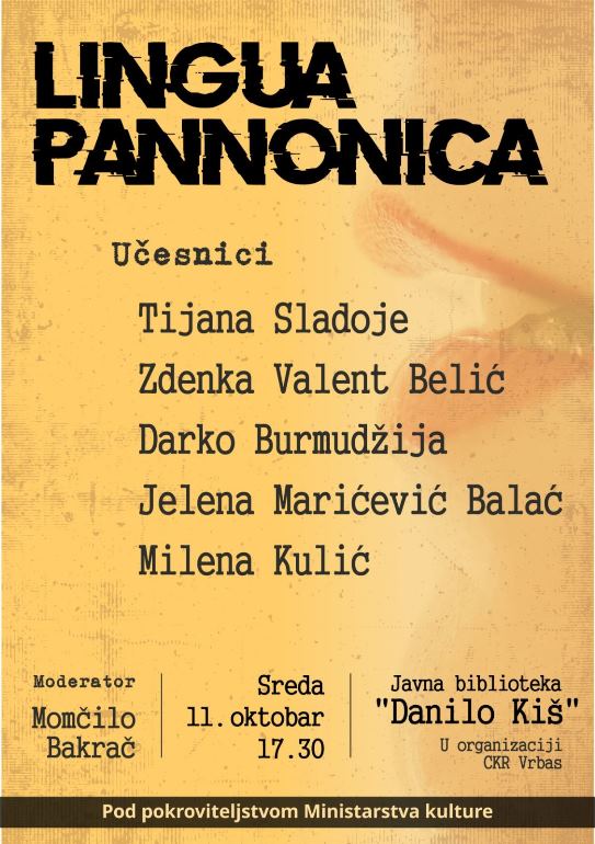 У три наврата љубитељи литературе имаће прилику да у Јавној библиотеци "Данило Киш" слушају афирмисане поете и прозаисте и упознају се са њиховим књижевним опусом. "Lingua Pannonica" довешће у Врбас, у среду 11. октобра, песникиње Тијану Сладоје, Зденку Валент Белић, Јелену Марићевић Балаћ и Милену Кулић, и песника Дарка Бурмуџију, са којима ће од 17.30 часова разговарати модератор, књижевник из Врбаса Момчило Бакрач.