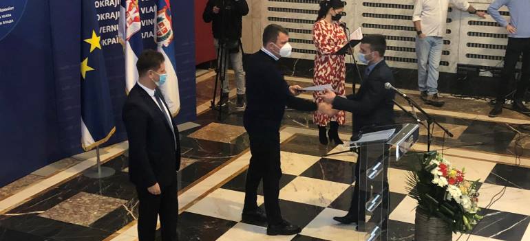 Председник Покрајинске владе Игор Мировић уручио је данас уговоре представницима 24 локалне самоуправе за финансирање и суфинансирање инфраструктурних пројеката у областима саобраћајне инфраструктуре, водоснабдевања и заштите вода, локалног и регионалног економског развоја, основног образовања и васпитања и развоја спорта.