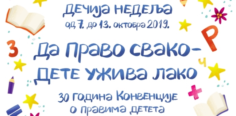 Од 07. до 13. октобра одржава се Дечија недеља. Ове године манифестација обележава значајан јубилеј - 30 година Конвенције Уједињених нација о правима детета, најзначајнијег међународног документа у области у области људских права који се тиче детета, као и најшире прихваћеног правног инструмента за заштиту људских права. Мото овогодишње Дечије недеље је "Да право свако - дете ужива лако".